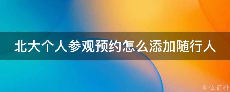 最佳答案1、关注北京大学微信公众号,点击参观北大进入小程序。2、在小程序中,选择预约、了解校园、校园导览等功能。3、填写预约信息,包括姓名、身份证号、手机号等。4、在填写预约信息时,选择添加随行人,输入随行人的姓名、身份证号、手机号等信息。5、确认预约信息无误后,提交预约申请。6、等待北京...