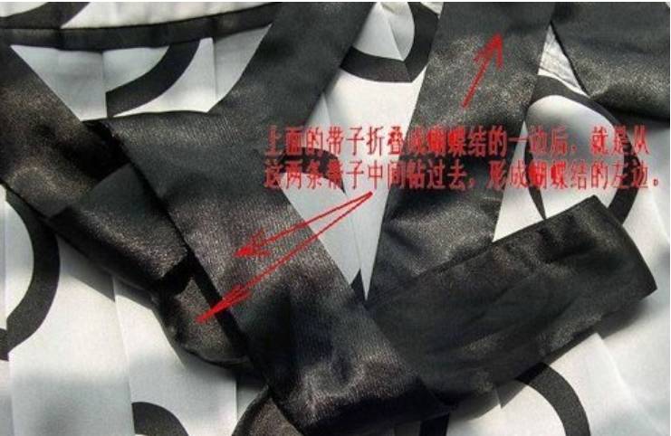 4、上面的带子折叠成蝴蝶结的一边后,从两条带子中间钻过去,形成蝴蝶结的左边。