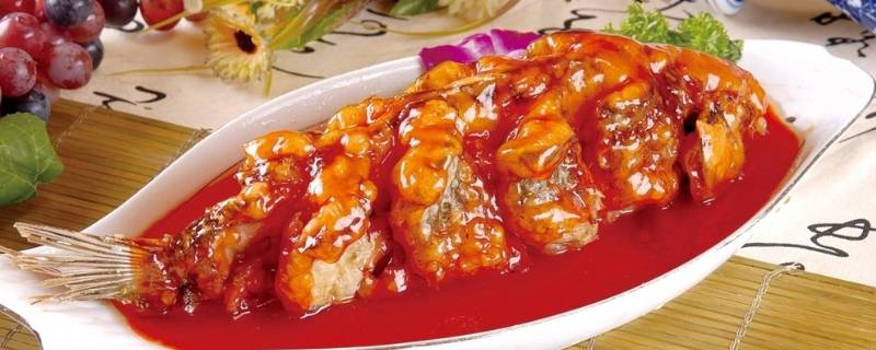 2、糖醋鲤鱼:鲤鱼打斜刀;锅中加入油,将鱼用中火煎至两面金黄;加入盐、糖、白醋、番茄酱然后加入清水,煮沸后,转小火炖1小时即可。