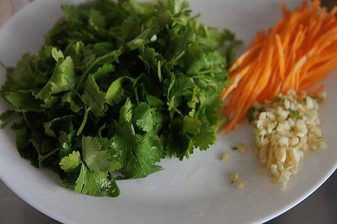3、香菜切段,胡萝卜切丝,大蒜切碎。
