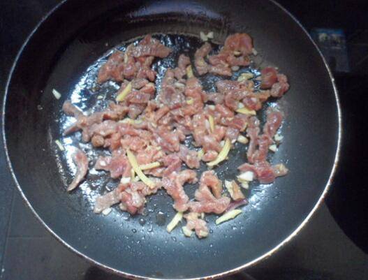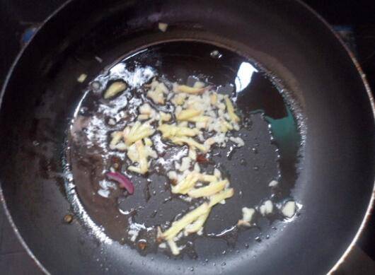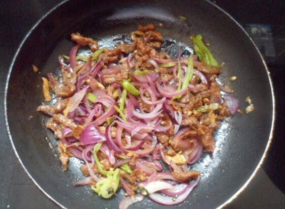 2、热锅倒油放入洋葱、青椒丝盐煸炒熟盛出。