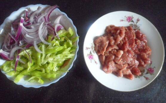 用料:牛排200克、食盐适量、青椒2个、洋葱1/2个。