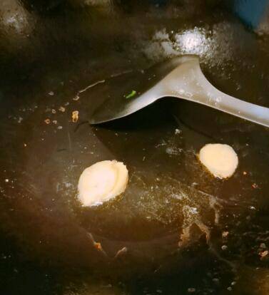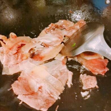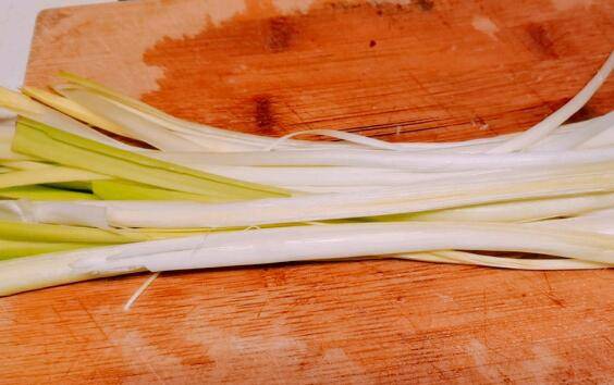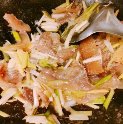2、带皮牛肉切片,大蒜叶斜刀切寸段,姜片准备好。