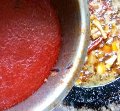 加郫县豆瓣酱炒香,加火锅底料,放醪糟炒香,掺入高汤。