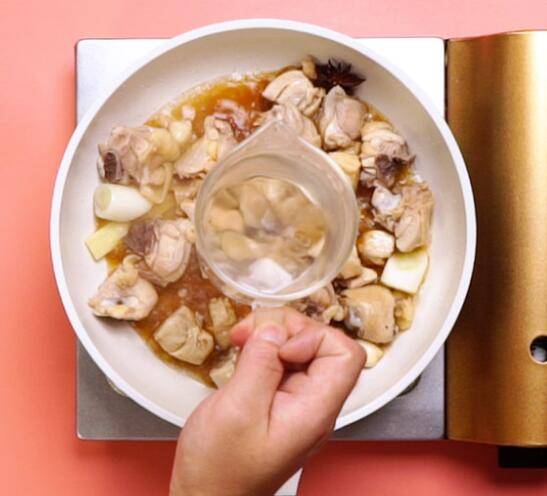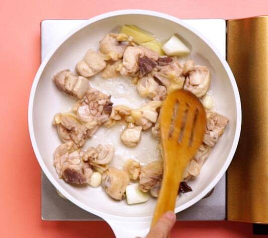 4、放入鸡肉,加入生抽10克,翻炒均匀。