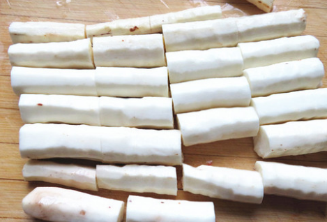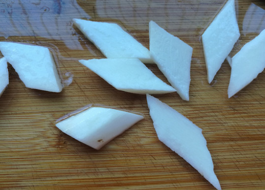 4、把山药先斜切成段,然后再切成菱形片。