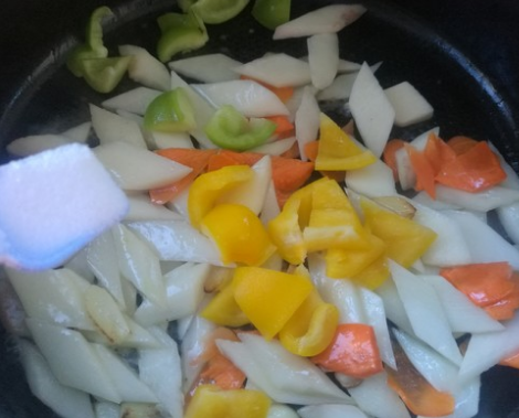 7、把切好的胡萝卜片放进去,翻炒几下,然后把黄色甜椒块、青椒块也一起放进锅里,翻炒均匀,加入适量的盐调味,炒匀即可出锅装盘。