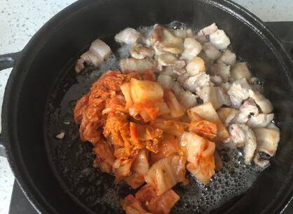 肉片两面都煎变色后放入泡菜翻炒,这时可以看到五花肉出来好多油。