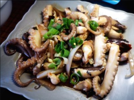 3、热锅放入植物油,油热后放入姜片和蒜片,出香后放入香菇,洋葱,蒜苗大火翻炒均匀。菜变色后放入八爪鱼迅速翻炒。
