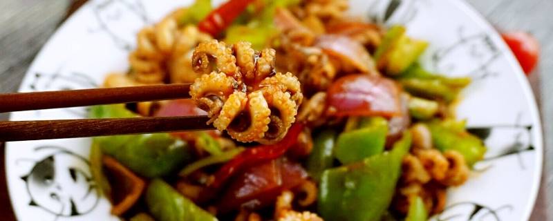 5、下入八爪鱼翻炒几下,加入圆葱。