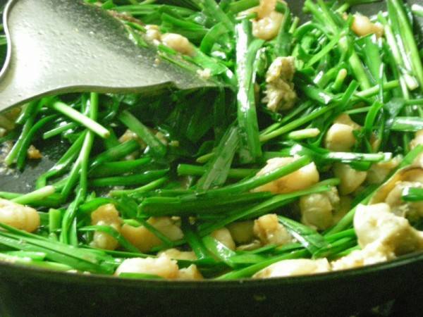 用料:韭菜200克、虾仁、花生油适量、食盐适量、味精适量、料酒适量。