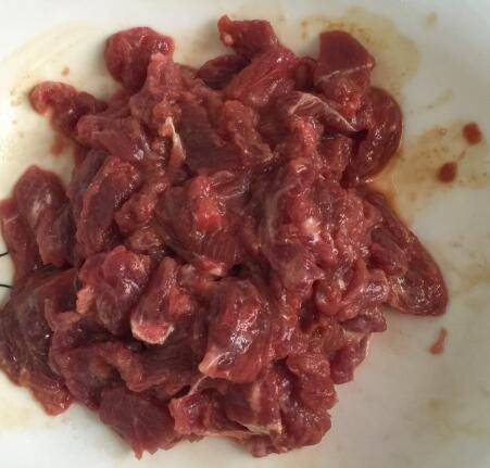 牛肉加红薯粉、生抽、料酒腌制十分钟。