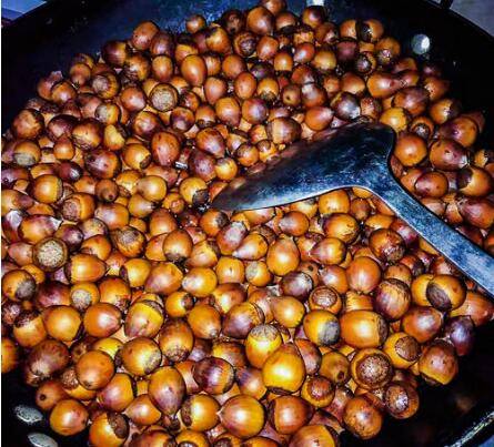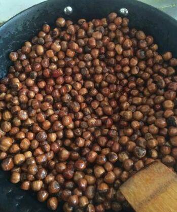 4、榛子的外表出现黑乎乎的油亮,也可以闻到一股木头的清香,再翻炒几分钟即可装盘食用。