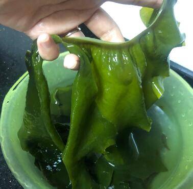 4、牛肉炒熟后,把裙带菜也倒进去炒一下。