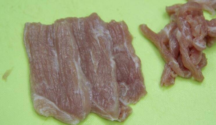 9.锅里放入适量的花生油,把前面腌制好的瘦肉丝倒入锅中,翻炒。