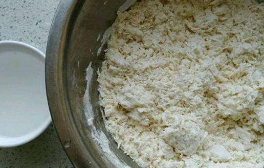 把酵母水倒入面粉中,用筷子搅拌均匀成棉絮,再准备一碗水。