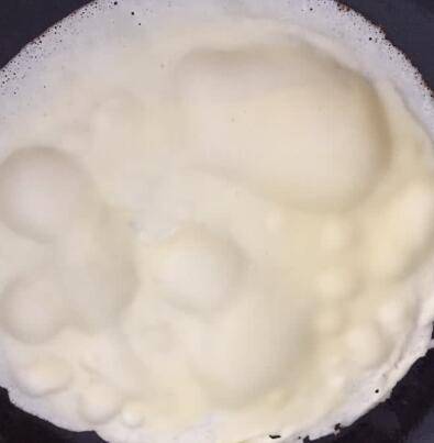 平底锅先擦一遍油,把面糊倒入。最好用一个勺子。每一张都放一勺面糊。这样煎好的冰皮大小一致。只需一面煎即可。然后依次煎好所有的面皮。