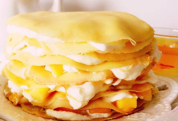 张面皮铺在盘子上。然后摸一层奶油,铺一层芒果,在抹一层奶油。依次类推。可以挑一张最好看的饼皮最上面一层用。光滑的一面朝上。
