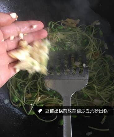 4、放盐跟胡椒粉,豆苗变软放入蒜翻炒五秒出锅。