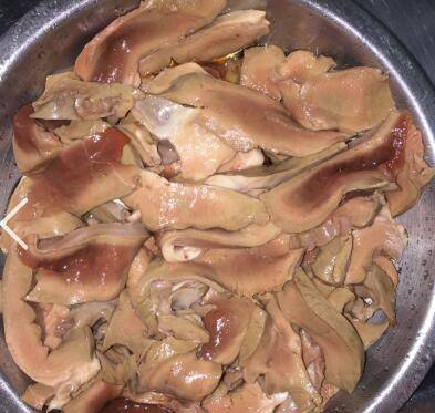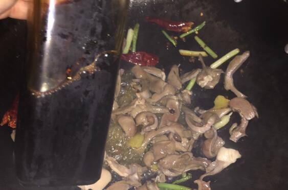 倒入猪心摊开,煎一下后翻炒,炒至猪心转色后加入酱油翻炒。