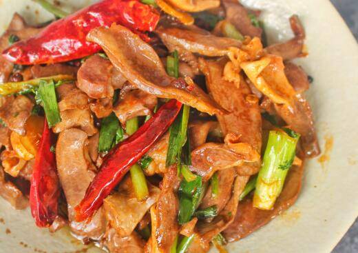 猪心焯水后洗净,切成薄片。油锅里放入葱白段和干辣椒、花椒爆香。