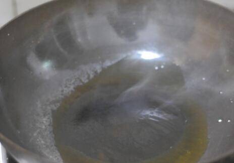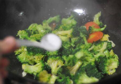 6、油锅烧热,将西兰花倒进去,稍微翻炒,将淀粉水沿着锅边淋入。