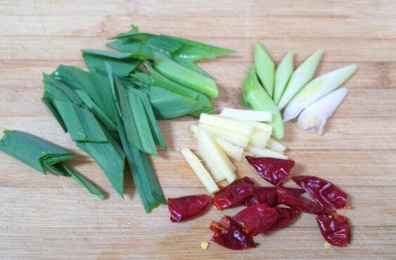 3、蒜苗洗干净切成段,叶子和蒜白部分分开,生姜切成丝,干红辣椒掰成两半。