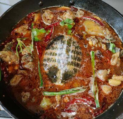 用料:甲鱼1只、鸡半只、火锅底料半块、啤酒两瓶、姜一块、大蒜10颗、小米椒20个、干辣椒一把、葱2根、香菜2根。