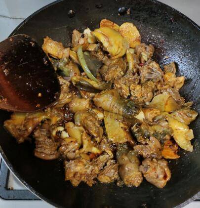 3、下入王八和小鸡,翻炒均匀后,加蒜头、生姜、八角爆香,用料酒去腥。