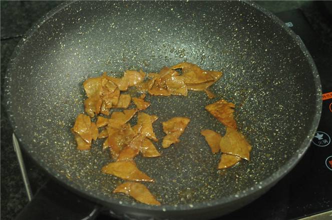 5、油锅烧热,将猪肝切薄片后放进去炒至变色。