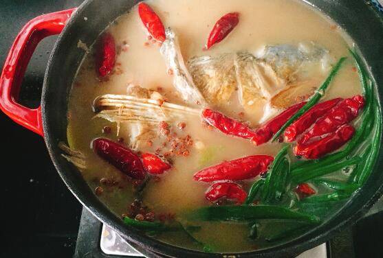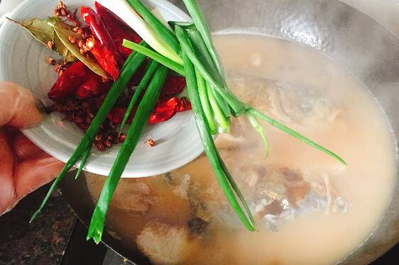 6、加入干辣椒、葱结、香叶、花椒烧开,这时可以稍微尝一下味道。