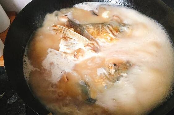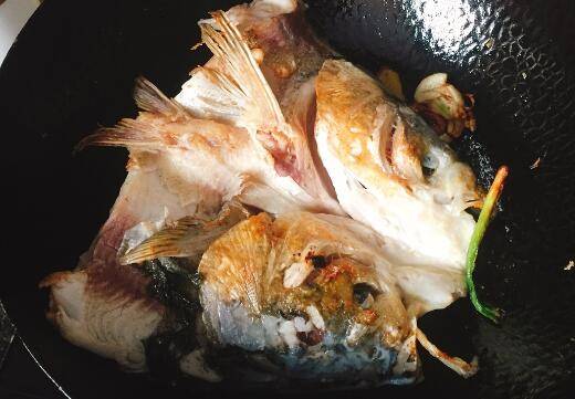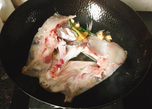 3、从锅边放入鱼头,小火慢慢煎,时不时拿起整个锅摇晃防止粘锅。