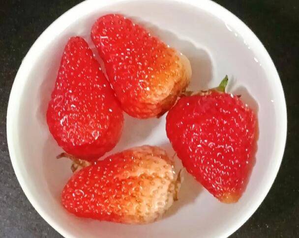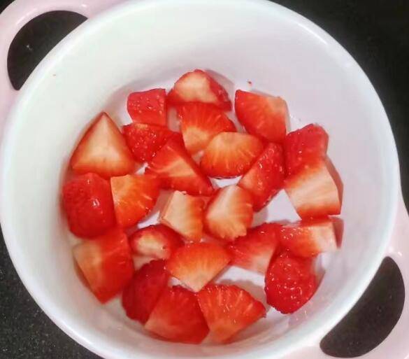 1、草莓清洗干净后用盐水浸泡五分钟。