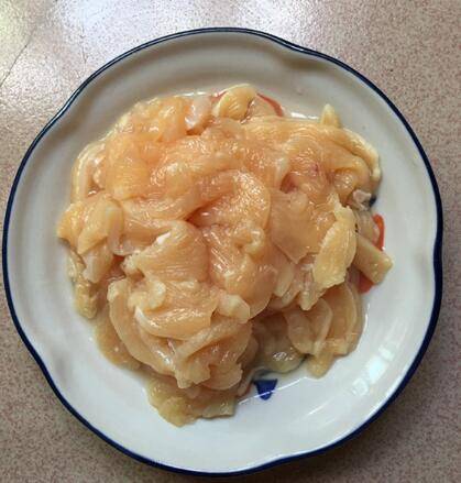 1、切丁后的鸡胸肉,加入适量的水淀粉上浆,可以让鸡胸肉无比滑嫩。