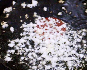待茄子腌出水后倒掉,热锅热油,放入一半的蒜末炒香。