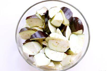 茄子洗净切滚刀块,不要太大,切小一点利于后续操作。放碗里,加1小勺盐腌制出水。