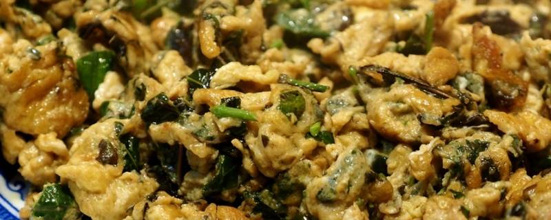 3、热油(适量,别太多,以免鸡蛋吃油太多而油腻)下椿芽鸡蛋液,煎至表面略凝固后翻面,煎至两面金黄熟透。