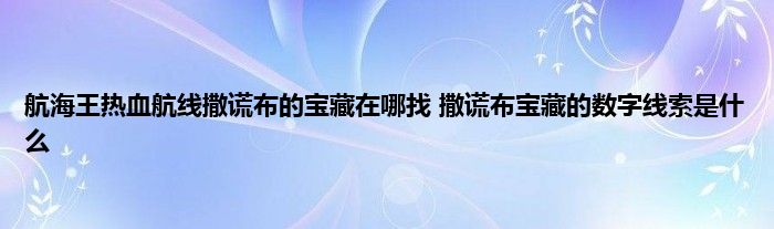 航海王热血航线撒谎布的宝藏前提是需要玩家找到四个数字线索,很多玩家都不知数字线索是什么,宝藏在哪里,那么航海王热血航线撒谎布的宝藏在哪找?蚕豆小编为您带来航海王热血航线撒谎布的宝藏位置。