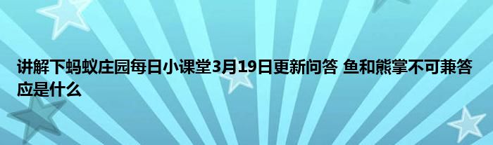 今天蚂蚁庄园每日小课堂3月19日更新问答 鱼和熊掌不可兼答应是什么,相信现在玩蚂蚁庄园的人都很想知道今天这个问题的答应吧,那现在小编就给大家说说蚂蚁庄园每日小课堂3月19日更新问答 鱼和熊掌不可兼答应是什么,希望小编说的会给大家带来帮助。