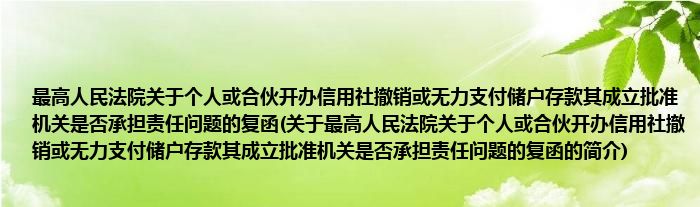 本文关于最高人民法院关于个人或合伙开办信用社撤销或无力支付储户存款其成立批准机关是否承担责任问题的复函的简介就讲解完毕,希望对大家有所帮助。
